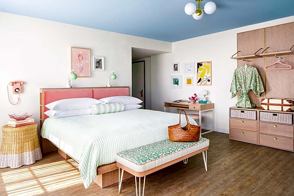 This room is decorated in vibrant colors and leopard print accents. It has a queen-sized bed, a 55-inch flat-screen TV and a bathroom with bath robes. Additional amenities include storage space, blackout blinds and an in-room safe.